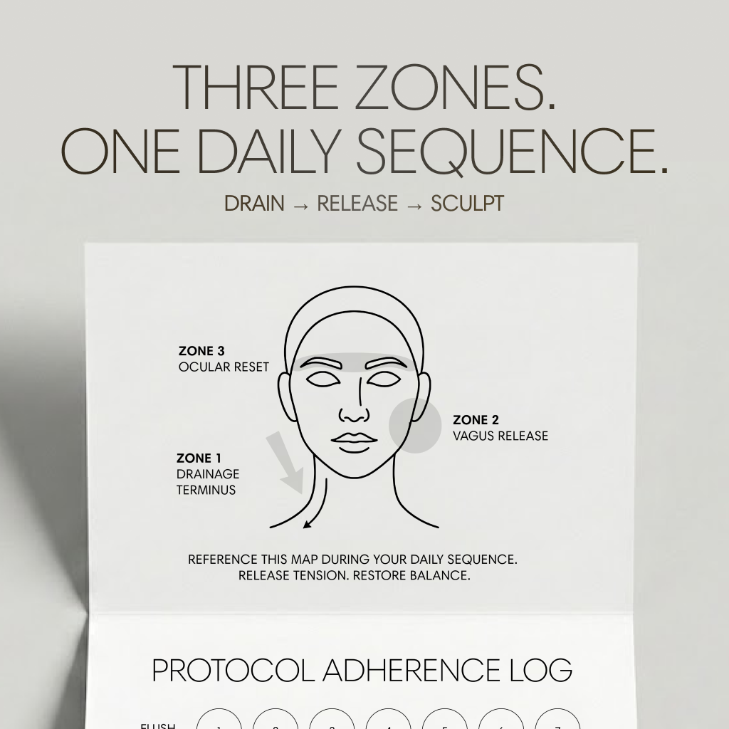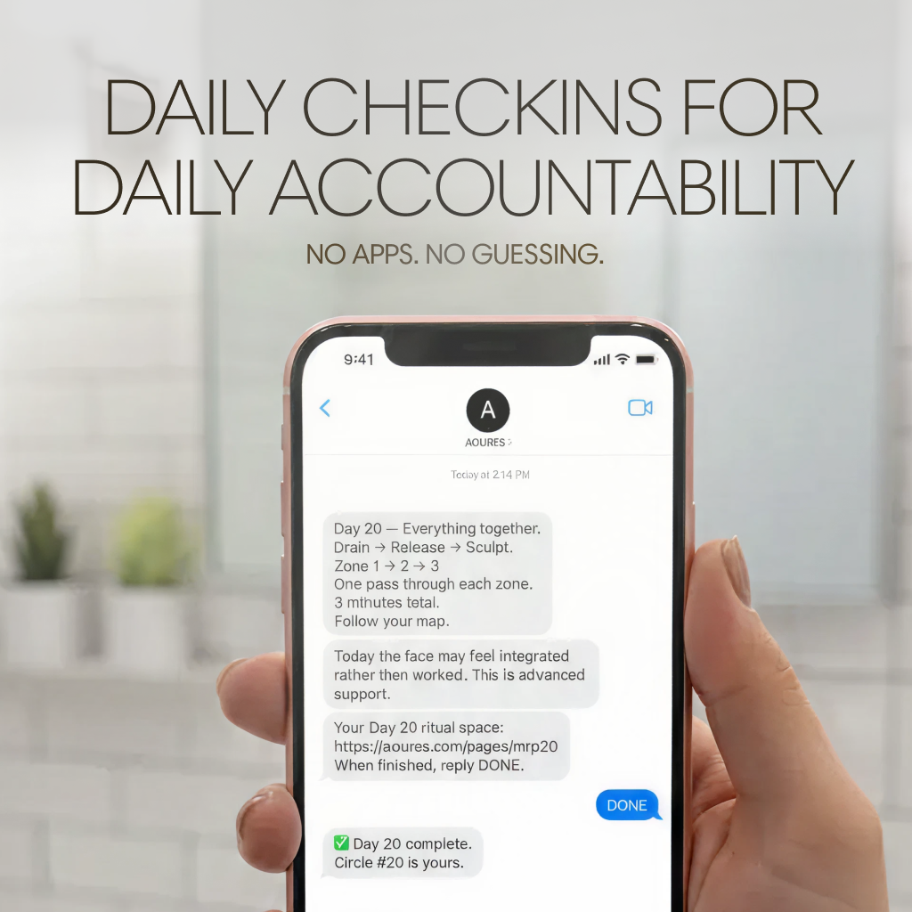 The AOURES Mirror Reset Protocol is a 21-day facial reset system designed to help reduce morning puffiness, release habitual facial tension, and restore a calmer, more rested facial baseline.