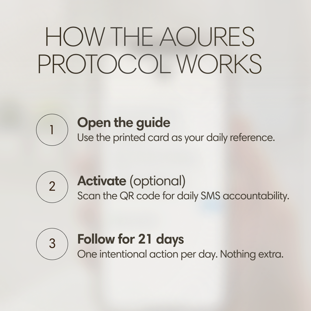 - 1× AOURES Mirror Reset Protocol Guide (Folded Card)– Facial zone map– 21-day adherence log
